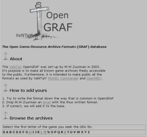 Its main purpose is to provide an open database of specifications of Game Resource Archive Formats (GRAFs) and other helpful information and tools to deal with those archives to support legal game modding.